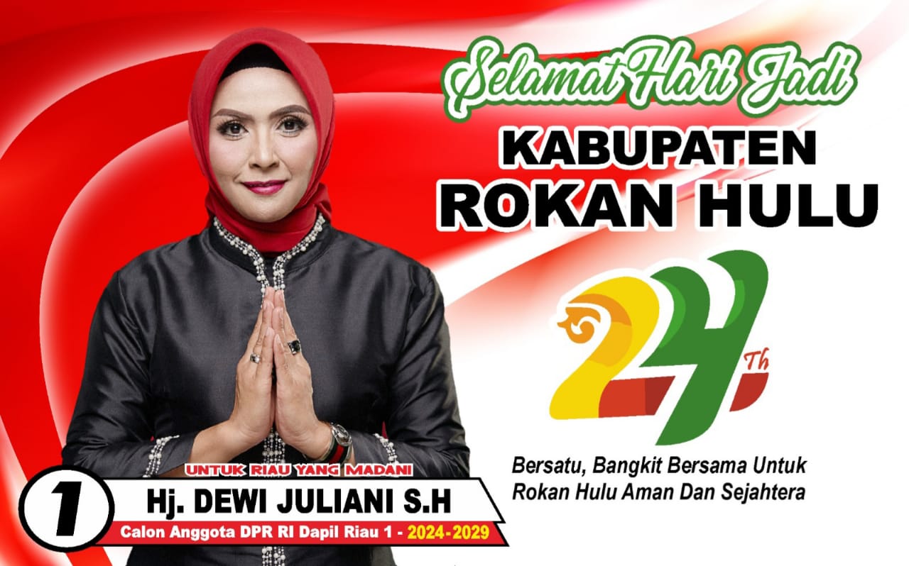 Pekanbaru (sekilas riau) — Ketua Gerakan Nelayan dan Tani Indonesia (GNTI) wilayah Provinsi Riau, Hj Dewi Juliani SH turut memberikan ucapan Selamat HUT Kabupaten Rokan Hulu yang ke-24.