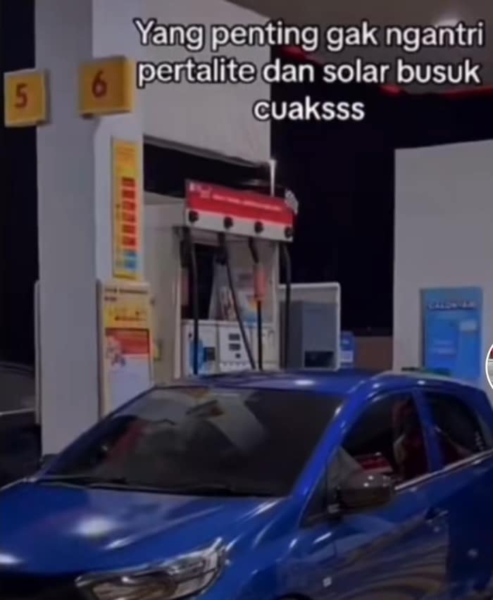 Dalam foto unggahan, ada sebuah mobil brio berwarna biru tengah berada di salah satu SPBU seperti ingin mengisi bahan bakar. Dalam caption keterangan unggahan disebutkannya Pertalite dan Solat busuk.
